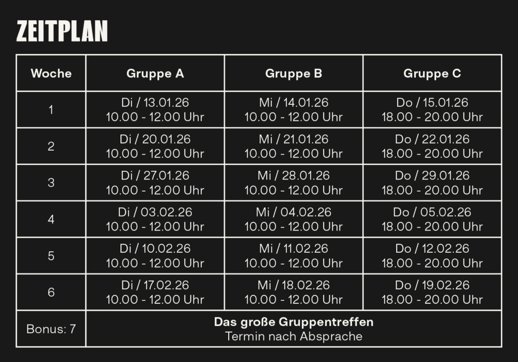 Die Masterclass dauert 6 Wochen. In der Zeit haben wir jede Woche zum selben Zeitpunkten einen Videocall mit deiner 5er-Gruppe für 90 Minuten.