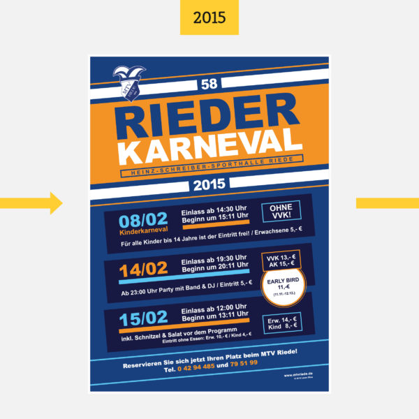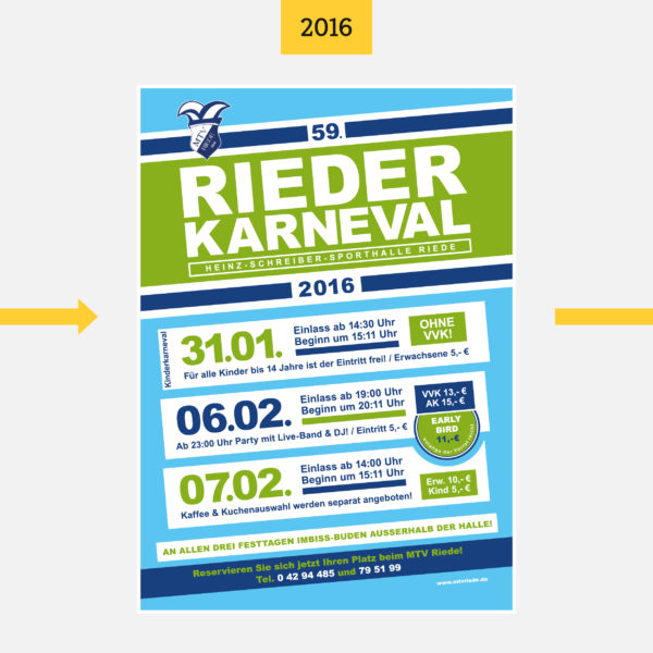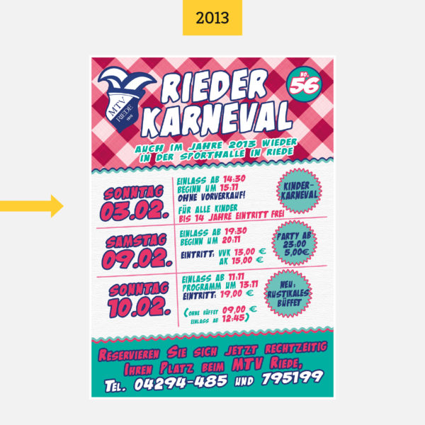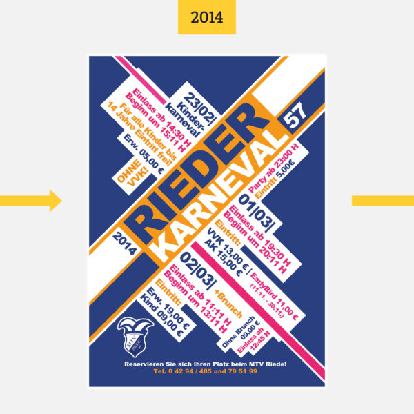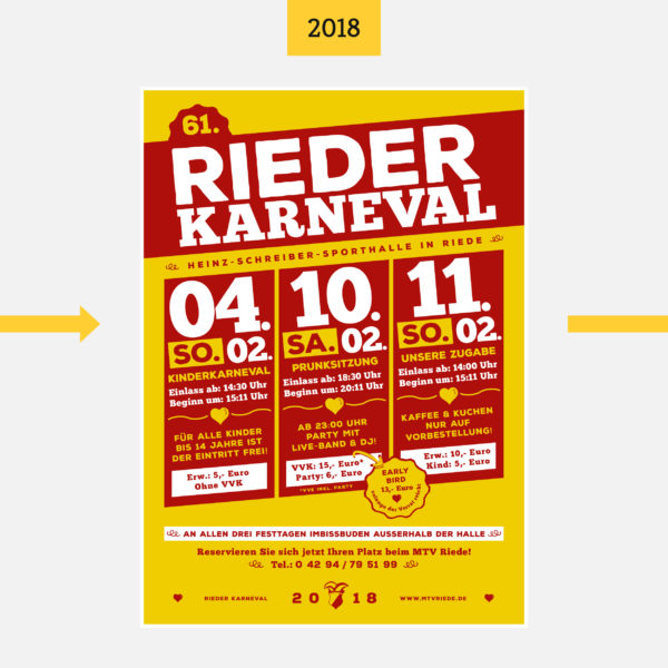 Seit 2013 kümmere ich mich um das komplette Corporate Design des Karnevals in Riede. Dieser kleine Ort bei Bremen verwandelt sich für zwei Wochenenden im Jahr zu einer Partyhochburg der Extraklasse. Hunderte ehrenamtliche Helfer und diverse Experten-Teams organisieren die gesamte Veranstaltung. Wir werden jedes Jahr besser und das macht alles noch viel großartiger.