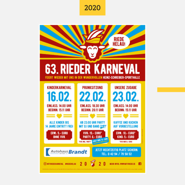 Über diesem Text siehst du die Plakat-Historie der vergangenen Jahre. Man sieht eine klare Entwicklung, die 2020 auf ein neues Level gehoben wird. Der Look wird noch eigenständiger und bekommt mit dem Maskottchen ‚Rolf‘ mehr Persönlichkeit. Das Wappen des Ortes Riede beinhaltet eine Schafschere, die somit wieder aufgegriffen wird. Farben werden bunter, Abläufe der Planung runder und das gesamte Event steigert sich von Jahr zu Jahr.